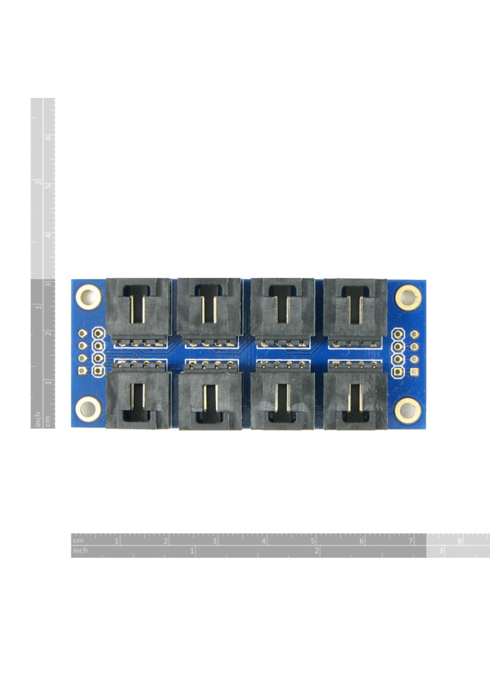 This I2C extender has eight 4-pin interlock connectors on board. The pinout of the connector is the same as on Arduino Sensor Shield, which is, from top to bottom, GND, VCC, SDA, and SCL. All pins with the same function are connected in parallel. By using a 4-pin cable connected to an Arduino Sensor Shield, the power and signal are duplicated on all the rest seven connectors. This eases the wiring for your I2C peripherals or modules. You only need to use a 4-pin cable to connect your module to any of the seven remaining connectors in order for your module to be powered and hooked onto the SDA and SCL bus.